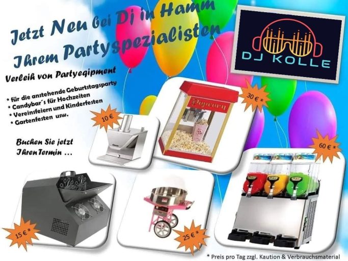 Entdecken Sie unser umfangreiches Sortiment an Mietartikeln für Ihre nächste Party. Dj Kolle in Hamm bietet Ihnen alles, was Sie für ein gelungenes Event benötigen. Von Slush Eis Maschinen bis zu Hot Dog Wärmern über festliche Beleuchtung und Zubehör ist unser Angebot vielfältig und hochwertig.